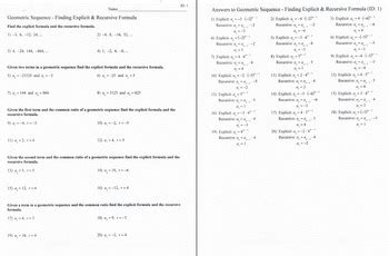 What are the Answers to Geometric Recursive and Explicit Worksheets?